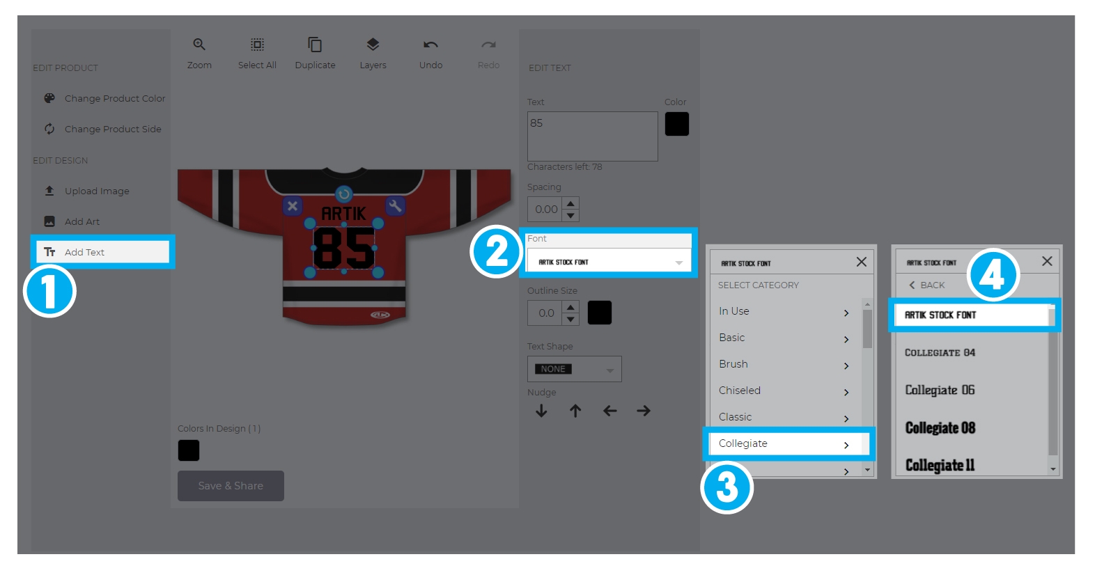 The online design studio includes a preview feature for names and numbers. To add them, look for the Collegiate Category within the font options and select Artik Stock Font to generate a sample preview of how your jersey will look.