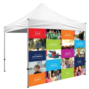 - Customizable Accessories: Enhance your tent's functionality and branding with optional full walls (approx. 10'x7') and half walls (approx. 10'x3'), available with custom printing (like full-colour dye sublimation on the full wall option).